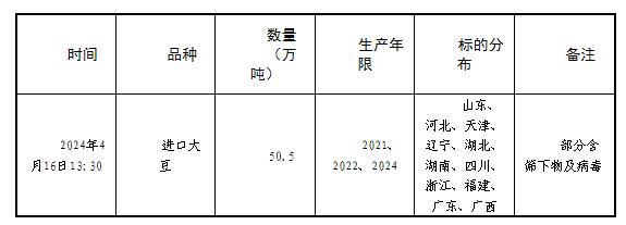 受中储粮油脂有限公司委托,2024年4月16日13:30在国家粮食和物资储备局粮食交易协调中心及联网的各省(区、市)国家粮食交易中心组织开展进口大豆竞价交易,请交易会员通过国家粮食交易中心官网()“用户中心”,登录国家粮食交易平台,在专场列表中选择“进口大豆竞价销售交易”参与交易。现就有关事项公告如下(重点提示内容详见加粗字体部分):